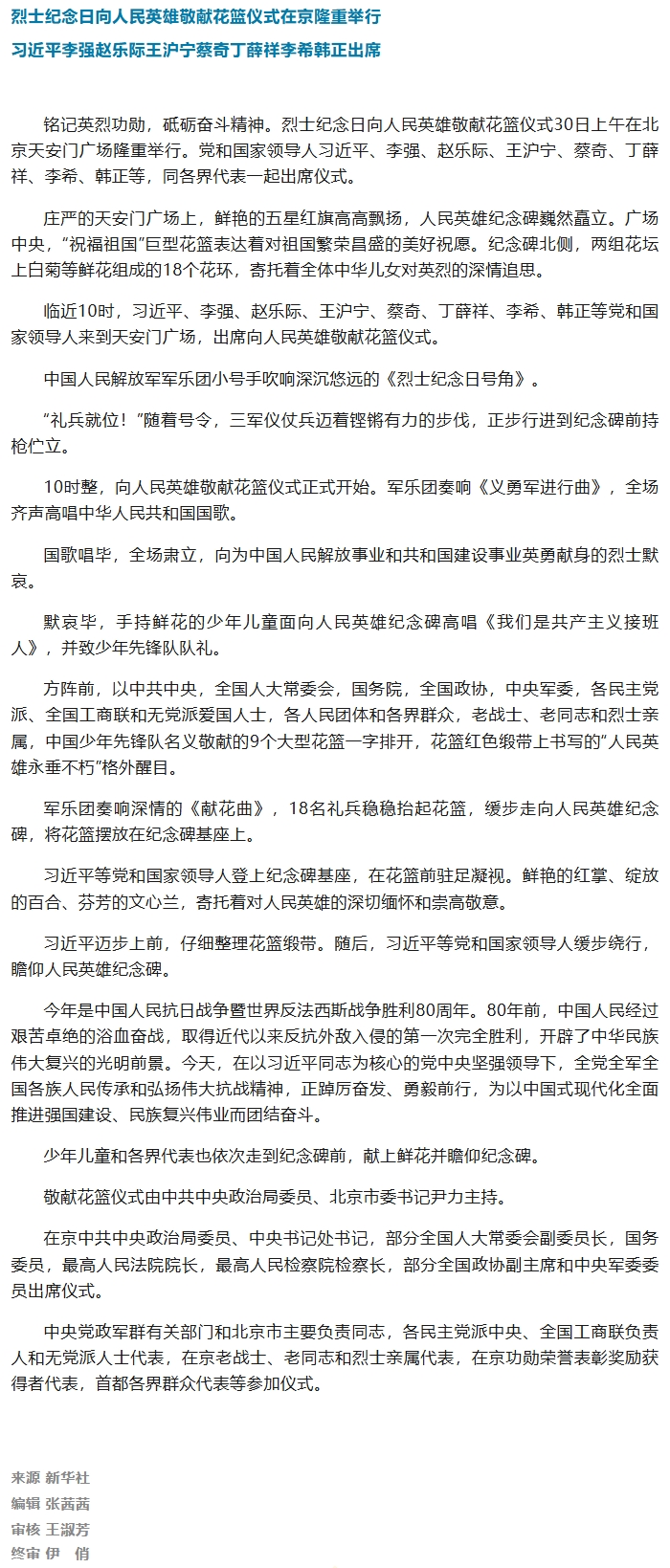 烈士纪念日向人民英雄敬献花篮仪式在京隆重举行 习近平等党和国家领导人出席