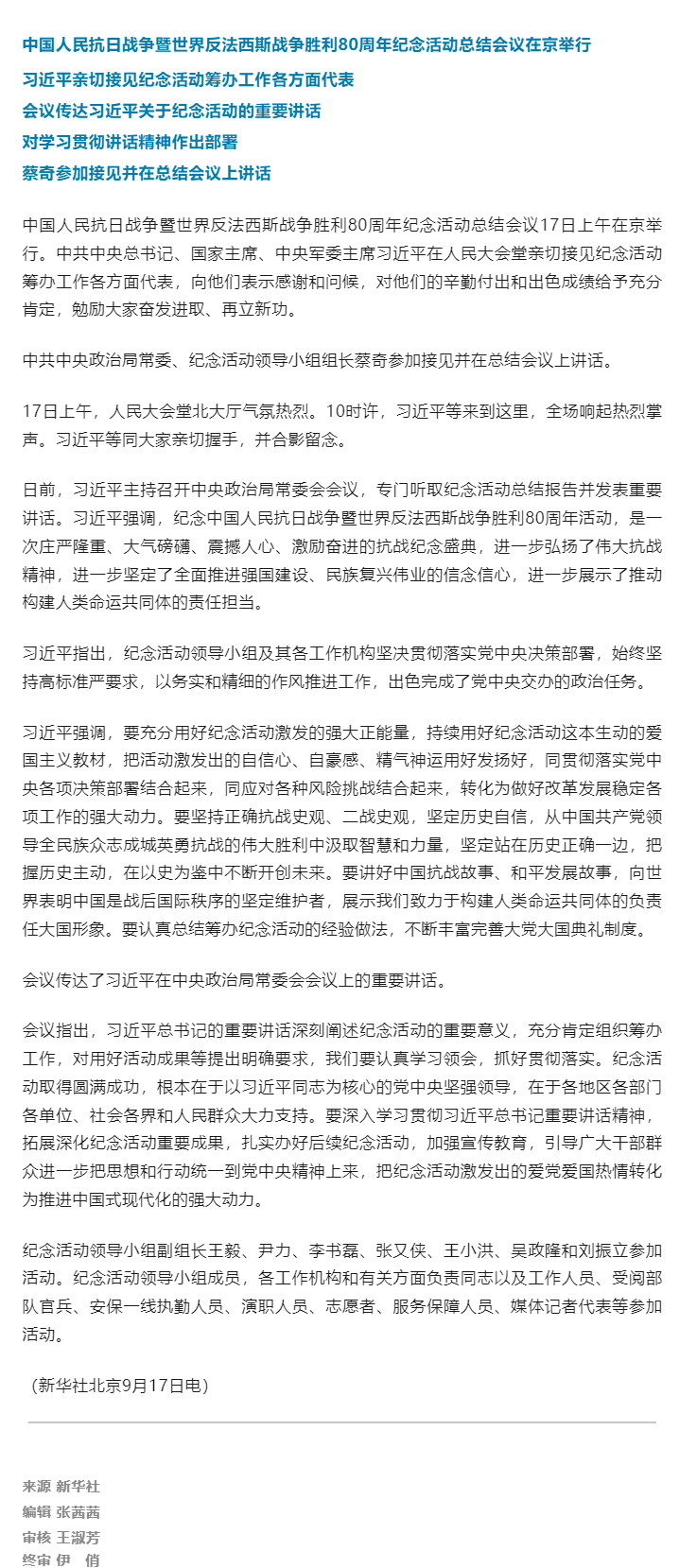 中国人民抗日战争暨世界反法西斯战争胜利80周年纪念活动总结会议在京举行 习近平亲切接见纪念活动筹办工作各方面代表