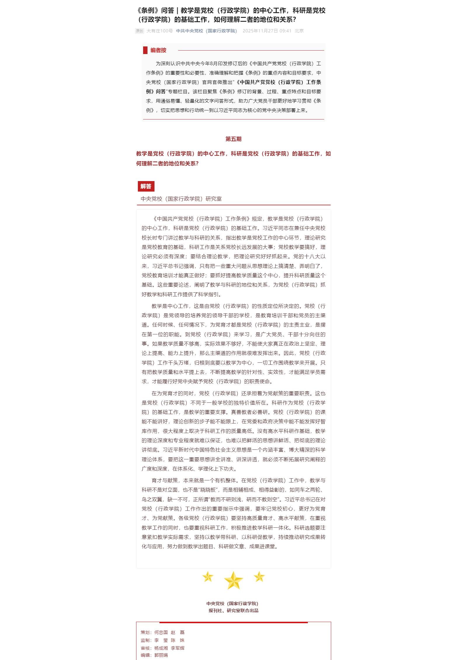 《条例》问答|教学是党校(行政学院)的中心工作,科研是党校(行政学院)的基础工作,如何理解二者的地位和关系?